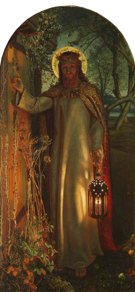 a lamp, knocking at a door overgrown with ivy and brambles. He clearly seeks entry, yet on closer inspection the door has no handle. The implication is that it can only be opened from the inside. What is depicted here is the door of the heart. Hunt captures what it means to knock and the door will be opened. Paradoxically, it is Jesus who is doing the knocking, and it is we who have the power to open or not.