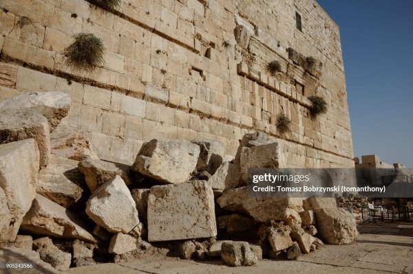 The Photo shows stones from the Second Temple in Jerusalem thrown by the Romans who destroyed the city in the 1st century AD. Robinson’s Arch is visible above the Herodian street in the southwestern corner of the Temple Mount. It was named after scholar Edward Robinson who discovered it. The arch supported a large staircase which was buit by Herod the Great as part of the expansion of the Temple Mount. Ophel Archaeological Park. GPS: N31.77580°, E35.23594°.