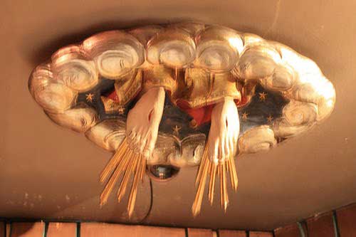 There is a rather ugly 1960s chapel at the Shrine of Our Lady of Walsingham – deep in the rural countryside of the county of Norfolk dedicated to the Ascension of our Lord. On entering the Chapel of the Ascension, one is greeted with a surreal experience. For in the center of the low ceiling is a gilded cloud ring plaster rosette from the center of which hang two bare feet – suspended in the air. Ostensibly belonging to Jesus with the rest of his body having already burst through the ceiling.